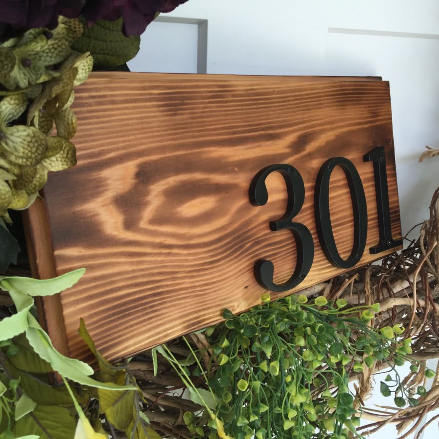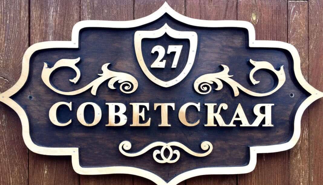 9. Изящная деревянная табличка с номером дома и названием улицы