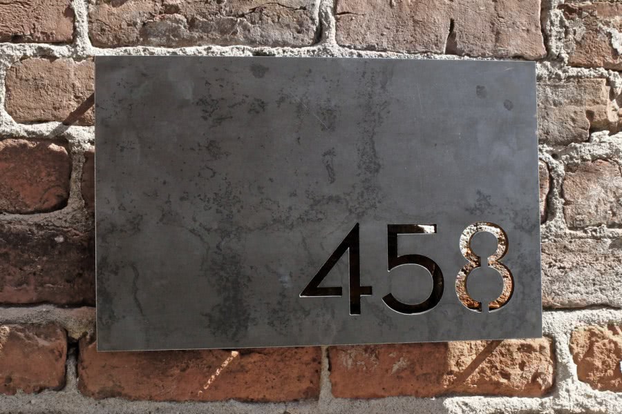 Адрес на металлической табличке может быть сделан с помощью лазерной резки. С обратной стороны табличку можно подсветить светодиодами, чтобы в ночное время выглядело эффектно. Лучше всего, чтобы металлическая табличка была покрыта темной красной и расположена на светлой стене. Шрифт выбирайте читабельный, без засечек.