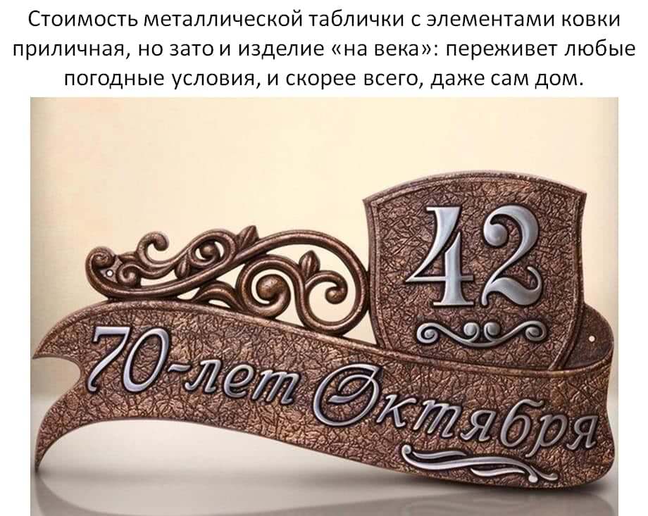 Если вы приравниваете себя к солидным домовладельцам, то обратите внимание на медный указатель. Этот металл отличается свой долговечностью, поэтому о смене таблички даже через несколько десятков лет можно не беспокоиться