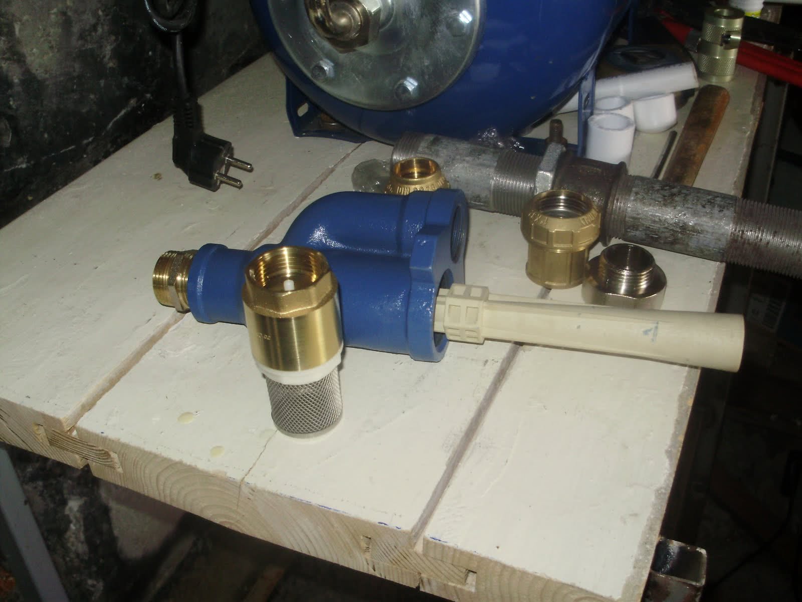 - Обычно насос продается в комплекте с втулкой и угловым отводом. Сначала в тройник вставить уплотняющий материал, затем соединить с втулкой. Уплотнить места соединений, например, силиконовым клеем.