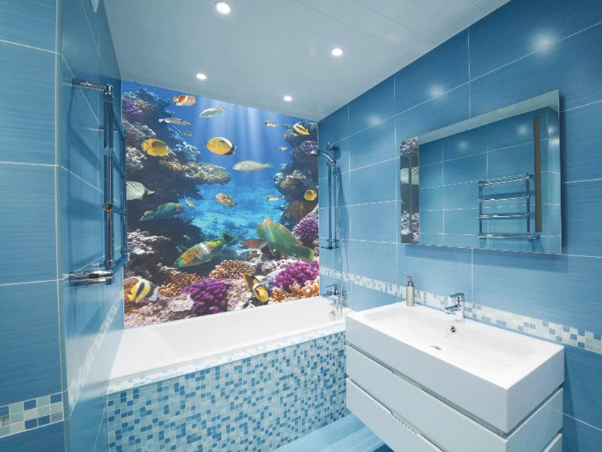 Легкий вес аквапанелей позволяет использовать их даже для оформления потолка. Если отделать материалом стены, получится идеальная поверхность для последующих финишных работ. Плиты можно покрасить, оклеить обоями, закрепить на них плитку или другие материалы.