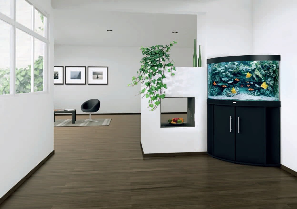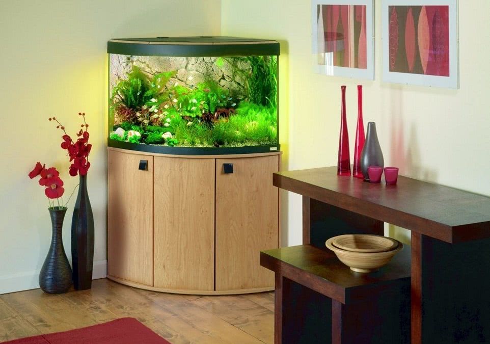 Маленький угловой аквариум располагают на столике или подставке. Он скорее подойдет для некрупных стайных рыбок. Если аквариум способен вместить до 500 л, то там без проблем смогут обитать более крупные особи, его устанавливают на мощном основании. Тумба должна составлять единое целое с остальными предметами мебели. 500-700-литровые аквариумы требуют обширного пространства, должны хорошо просматриваться.
