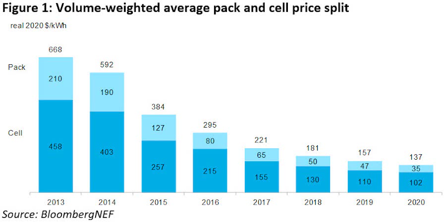 То, что в этом направлении активно идет развитие, подтверждает и исследование BloombergNEF, аналитики которого выяснили, что средняя цена литий-ионных аккумуляторов упала с $688 до $137 за киловатт-час за 2013−2020 годы. Они прогнозируют, что к 2023 году цены будут близки к $100 за кВт·ч.