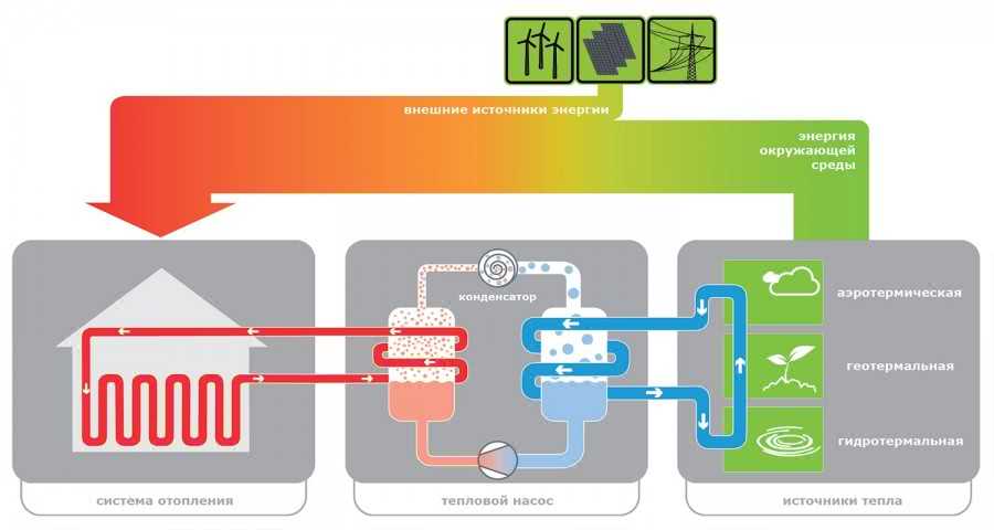 Тепловой насос преобразует низкопотенциальную энергию земли, воды или воздуха в высокопотенциальную тепловую энергию, которая позволяет вполне эффективно обогреть здание