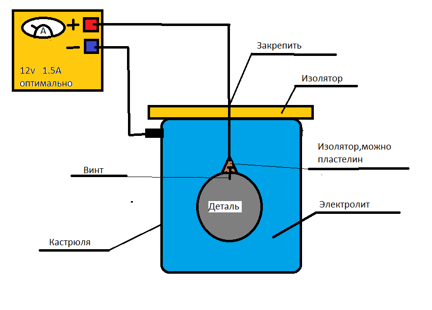 Емкость для анодирования должна быть достаточно объемной, чтобы в нее можно было полностью погрузить деталь. Кроме того, деталь должна быть зафиксирована так, чтобы не касаться дна посуды. Для этого можно использовать стойку или любой другой вариант – на личное усмотрение. Также нужно вдумчиво подойти к вопросу крепления детали, так как после анодирования в местах фиксации останутся следы.