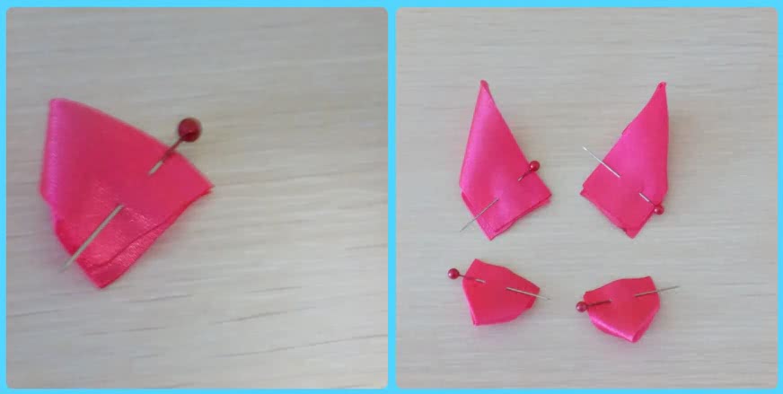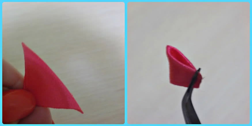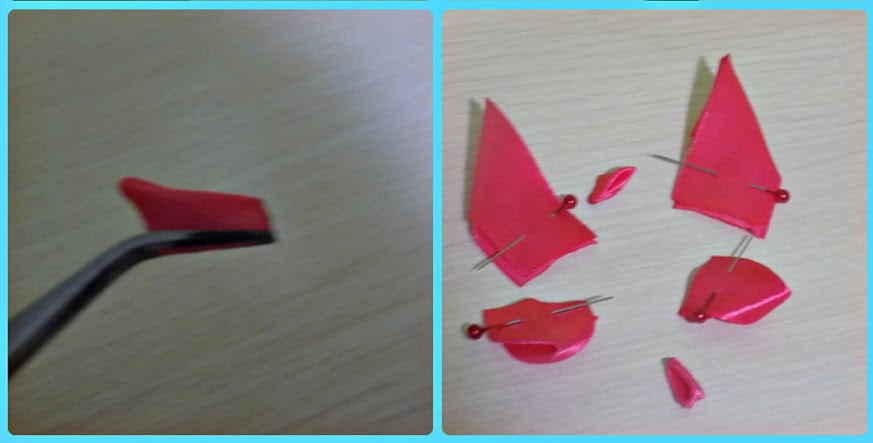5) Из ленты 2,5*2,5 см розового и белого цветов в количестве 8 штук делаем двойной острый лепесток. Полученные мелкие модели сзади подрезать не нужно.