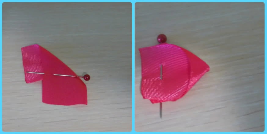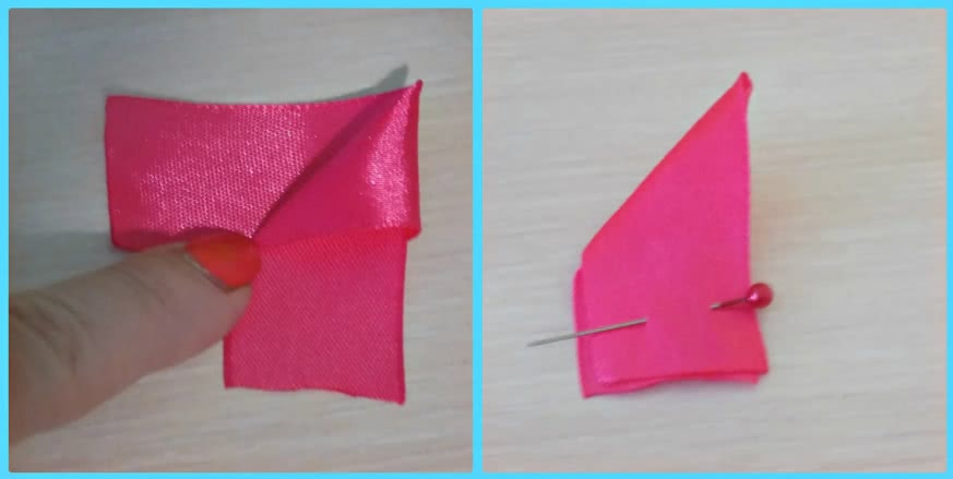Из отрезков ленты 5х5 см сделаем двойной круглый лепесток в складку. Складываем отрезки по диагонали, нижний чуть выше верхнего.