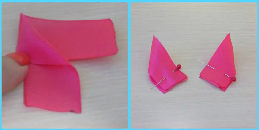Складываем два крылышка, воспользовавшись мастер-классом «Узкий лепесток канзаши». Свернув ленту дважды, накладываем треугольники друг на друга.