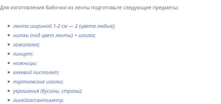 Чтобы сделать бабочку из атласных лент в технике канзаши, нам потребуются следующие материалы: