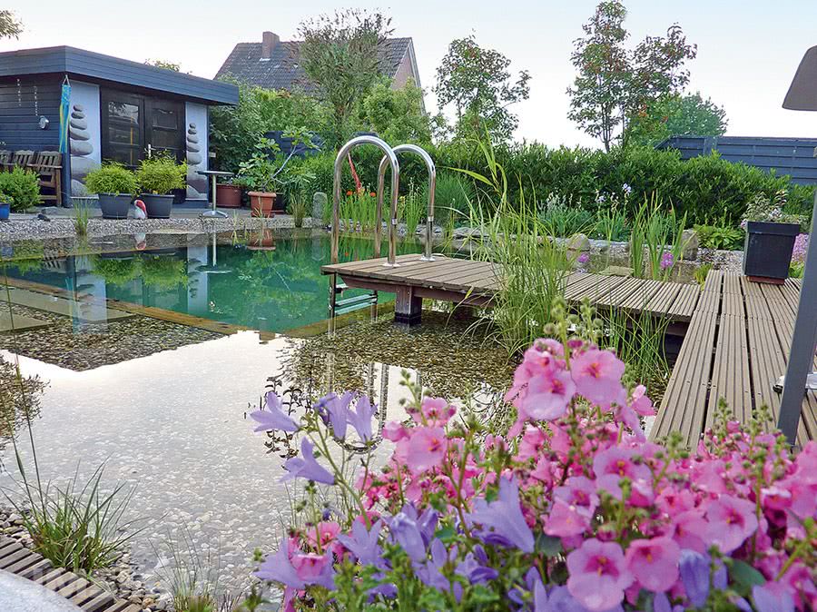 Преимущество натурального пруда состоит в том, что для его очистки не нужно покупать дорогостоящее оборудование в виде насосов и фильтров. Бассейн будет самоочищаться за счет посаженных в нем растений. Однако чтобы эти процессы происходили в полной мере, необходимо, чтобы растения занимали не менее 50 % поверхности.