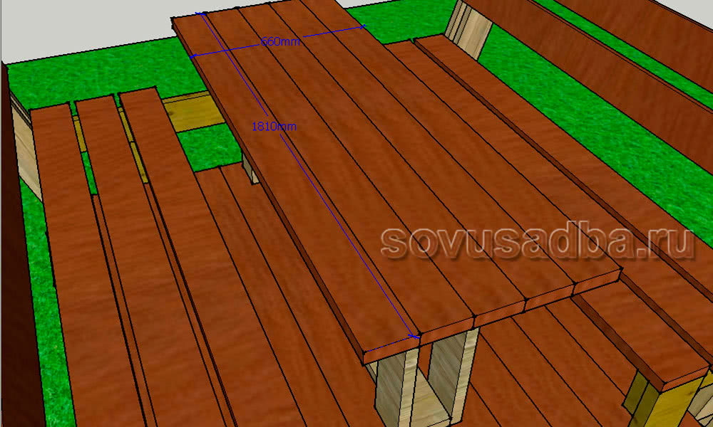 В отличие от лавочки и пола, щит стола сбивается с плотно подогнанных друг к другу и желательно сухих досок. А если на них и задержится влага, ее всегда можно будет смести.