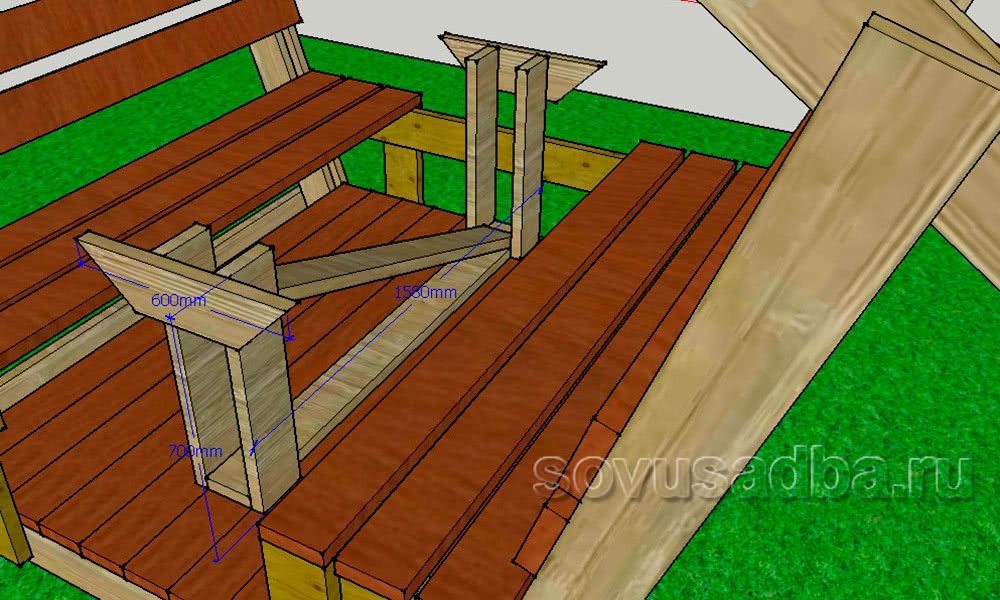 Остается зажить все это досками и две удобные лавочки готовы. А на очереди стол. Для него мы разработали вот такие симпатичные ножки. Как видите все делается из одного и того же пиломатериала сечением 150×50 мм, так что у вас должно остаться минимум образков.