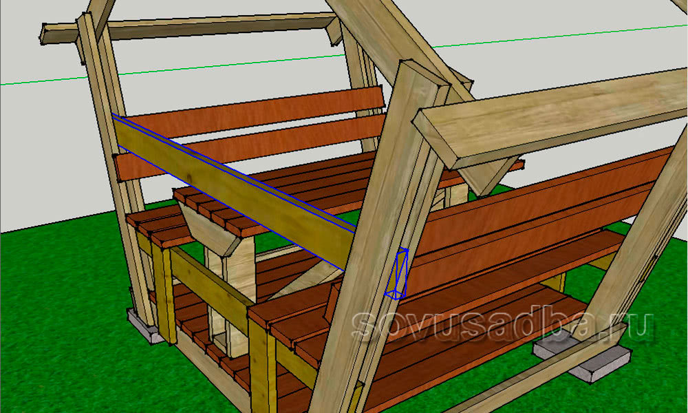 На очереди лавочки, а заодно и дополнительные стяжки для наших несущих ферм. Задняя «ножка» изготавливается из цельной доски и двух подпорок. Две передние представляют собой Г-образные конструкции, изготовление и установку которых мы изобразили на схеме.
