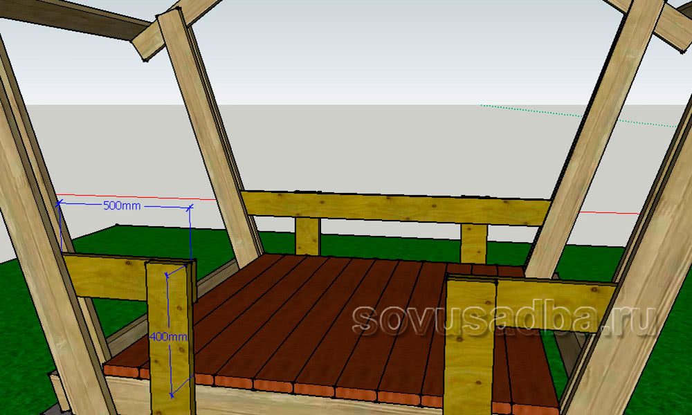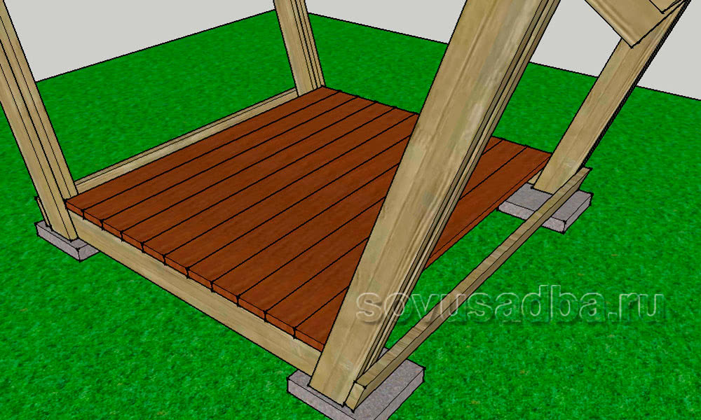 После крыши переходите к полу. Удалите уже ненужные раскосые и сформируйте с все той же сороковой доски красивый дощаный настил. Если пиломатериал у вас прошел камерную сушку оставляйте между досками 3-4 мм зазор. Если дерево естественной влажности, щели появятся сами. А нужны ни для того, чтобы после дождя в беседке не стояла вода.
