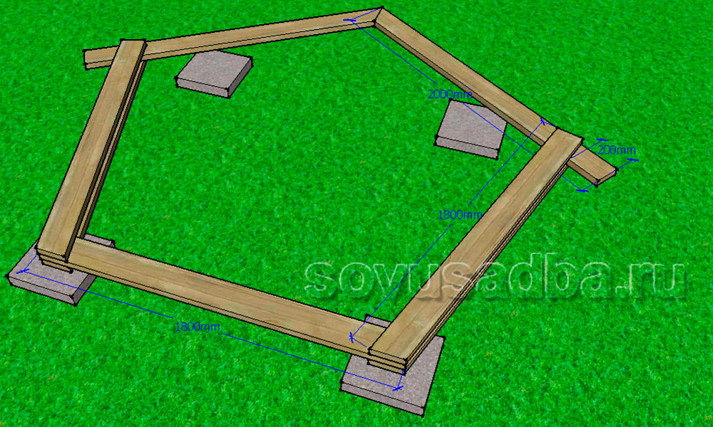 Теперь возьмите 5 досок длинной в 1800 мм и две доски длиной 2000 мм и сбейте с них правильный пятиугольник как на следующей схеме. Все выступающие углы подрежьте ножовкой, а верхний угол фигуры дополнительно укрепите деревянной ляпухой.