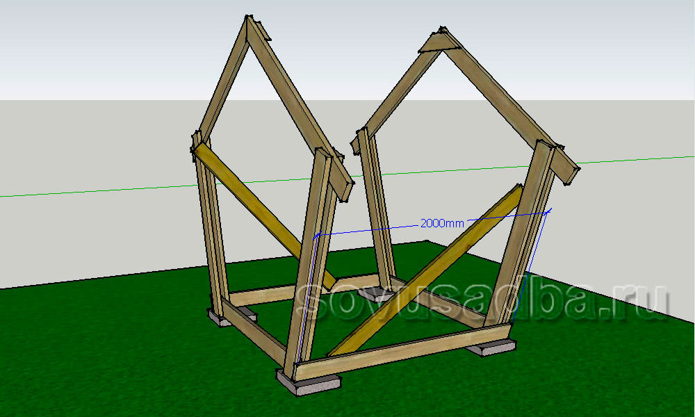 Хорошо перепроверьте диагонали, в правильном пентакле они должны быть одинаковыми. Если все получилось, по этой фигуре, как по шаблону изготовьте еще одну, такую же. Это и будут несущие фермы нашей беседки, их силовой каркас. А чтобы она приобрела реальные очертания, приподнимите конструкции в вертикальное положение, сбейте их основы двумя двухметровыми досками и зафиксируйте в таком положении при помощи раскосых. В результате у вас должна получиться вот такая картина.