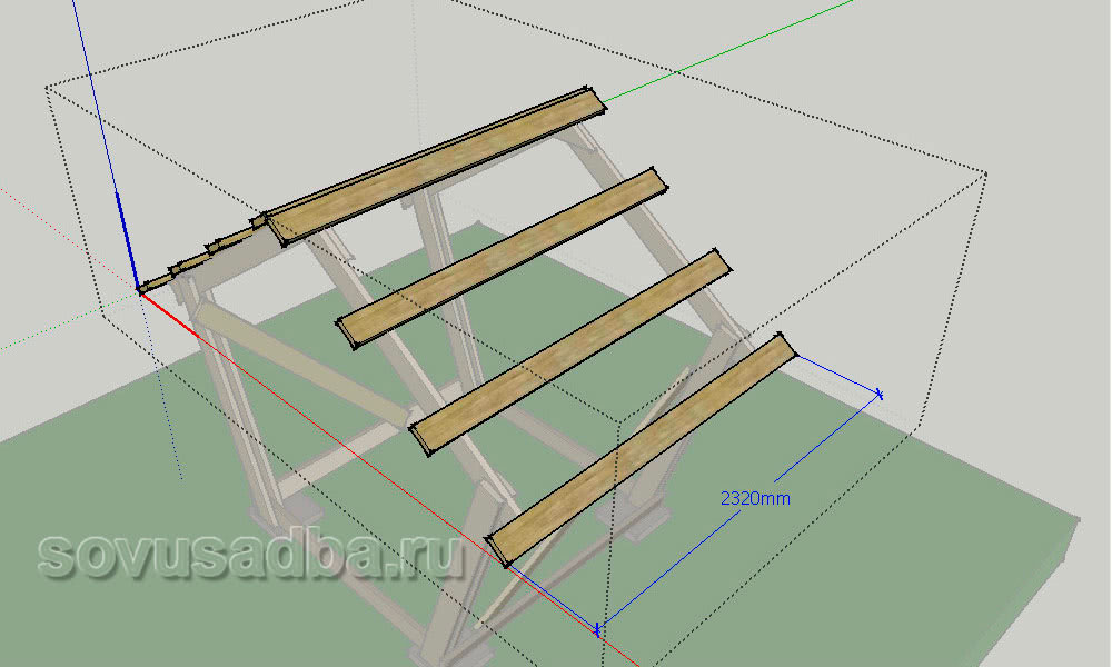 Свес стропил (т.е. выступ за переделы обвязки) должен составлять около 40 см. Сделаем больше – будет мешать обзору, сделаем меньше — ухудшится защита от дождя.