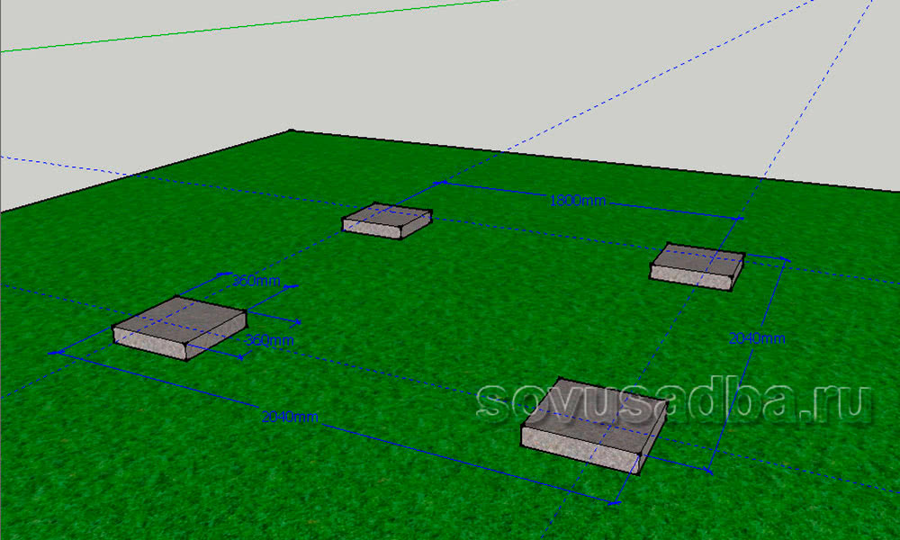 Разметьте на выбранной площадке квадрат 2040×2040 мм и установите по его углам бетонные блоки. Если они слишком большие вкопайте их в землю так, чтобы над поверхностью оставалось 70-100 мм. Но при этом их верхние грани должны находиться в одной горизонтальной плоскости.