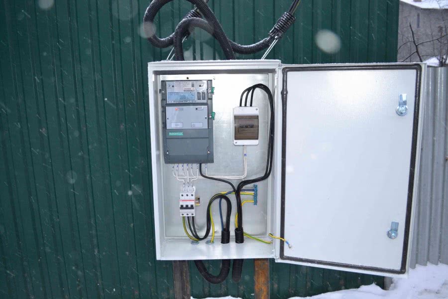 Прежде чем завести силовой электрокабель в здание, вам необходимо на наружной стене здания или на специальной опоре установить специальный, водонепроницаемый бокс, в котором будет располагаться рубильник, и осуществляться подключение электричества от столба.
