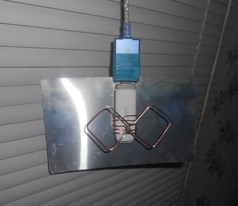 Можно вырезать два электрода из консервной банки или листа фольги. Длина их может быть 7,5 см, а ширина – 4,5 и 2,7. Их спаивают с выходами соосного кабеля, и они направляют усиленную волну на модемную антенну. Обязательно нужно развести электродные компоненты на некоторое расстояние.