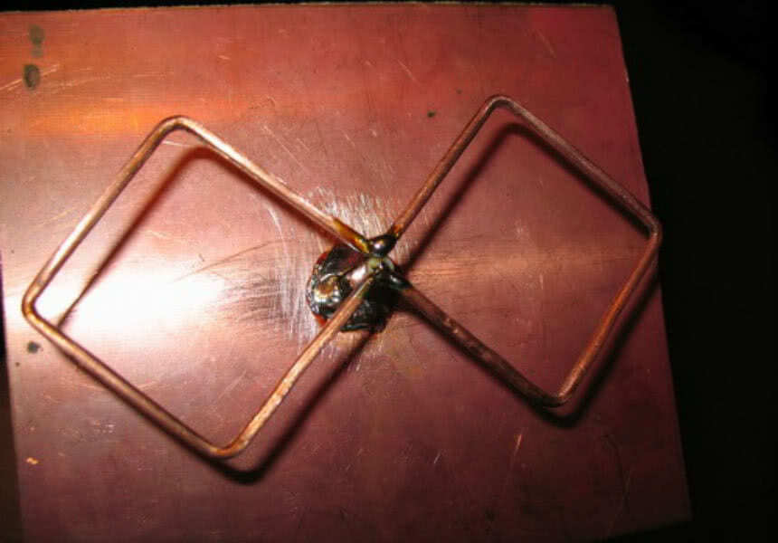 Чтобы их рассчитать, нужно знать частоту и длину волны. Сторона квадрата должна быть равна 25% последней. Опираясь на эти габариты, из медной проволоки подготавливают биквадрат-восьмерку с соприкасающимися углами. Если нужна горизонтальная поляризация, конструкцию ставят стоймя, если вертикальная – в боковое положение.