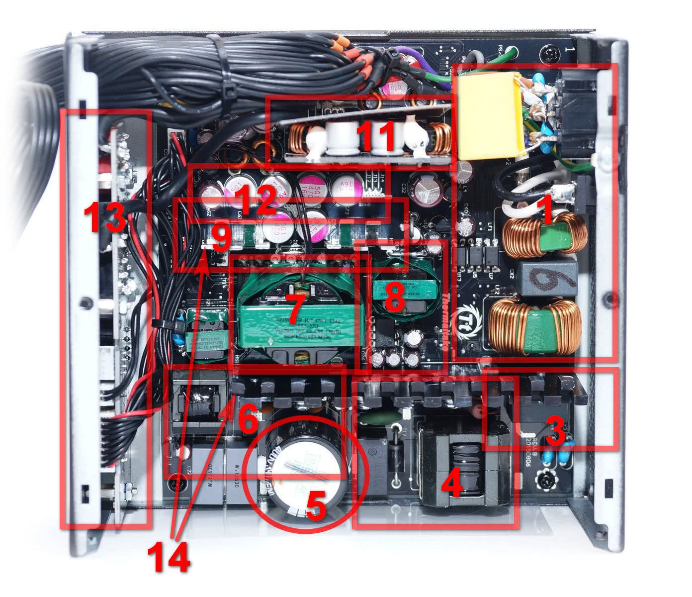 Разъём сетевого шнура находится в верхнем левом углу фотографии, и ток по сути идет по часовой стрелке, пока не достигнет выхода из блока питания (пучок цветных проводов, нижний левый угол).