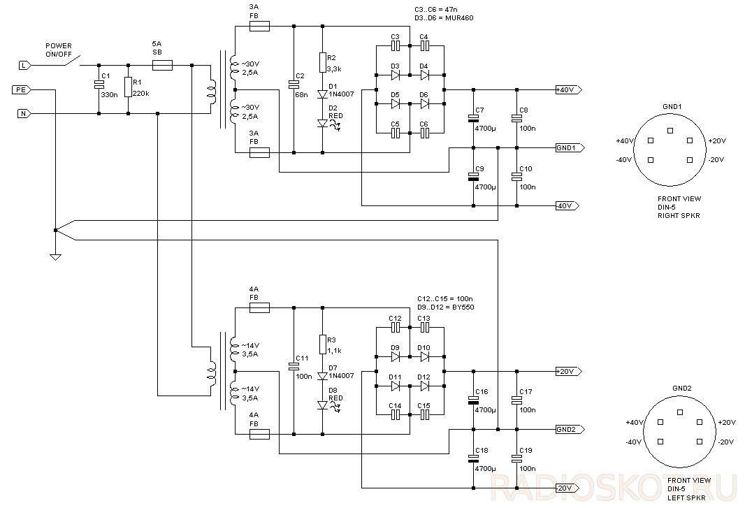 Схема блока питания — классическая конструкция двухполупериодного выпрямителя, вместо встроенных мостов использовались отдельные диоды, шунтированные конденсаторами. На первичной стороне размещен простой фильтр из имеющихся под рукой конденсаторов.