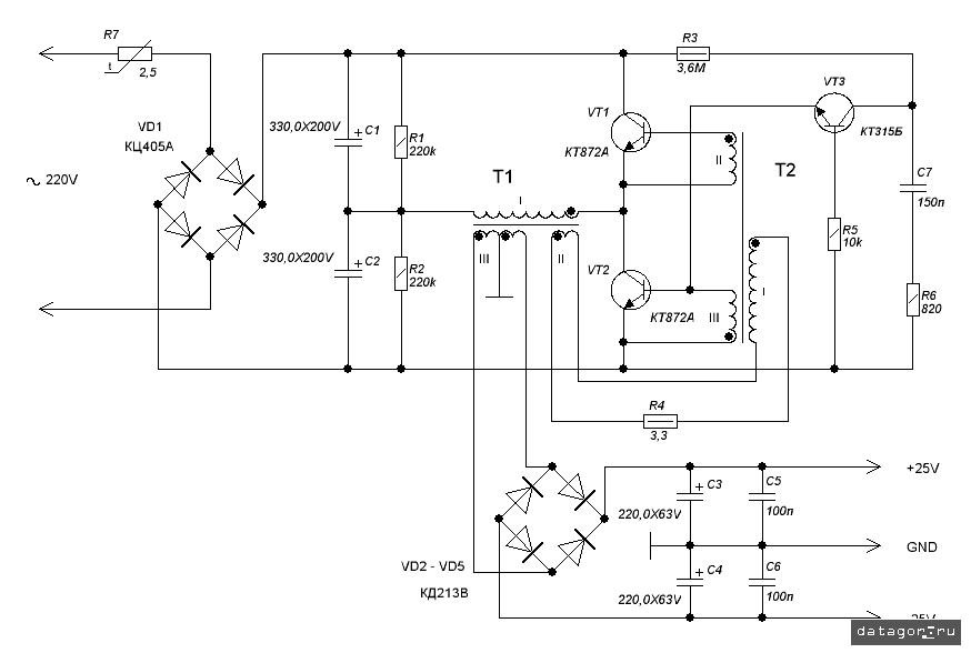 Она представляет из себя полумостовой инвертор с переключающим насыщаюшимся трансформатором. Конденсаторы С1 и С2 образуют делитель напряжения для одной половины полумоста, а так же сглаживают пульсации сетевого напряжения. Второй половиной полумоста являются транзисторы VT1 и VT2, управляемые переключающим трансформатором Т2. В диагональ моста включена первичная обмотка силового трансформатора Т1, который рассчитан так что он не насыщается во время работы.