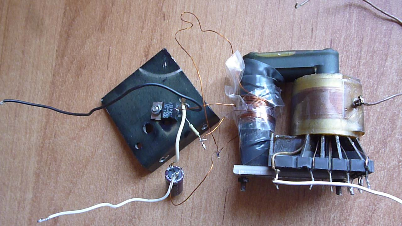 Транзистор лучше прижать (например болтом с гайкой) к радиатору для охлаждения. С выхода трансформатора разрядов может не быть поэтому нужен умножитель. Питать преобразователь можно от батарейки «крона» на 9В. Выводов умножителя лучше не касаться во время работы преобразователя, после отключения питания и прекращения работы преобразователя конденсаторы в умножителе всё ещё будут заряжены и умножитель может «ударить током», чтобы этого не произошло нужно ненадолго замкнуть выводы умножителя с которых возникают разряды при работе преобразователя.