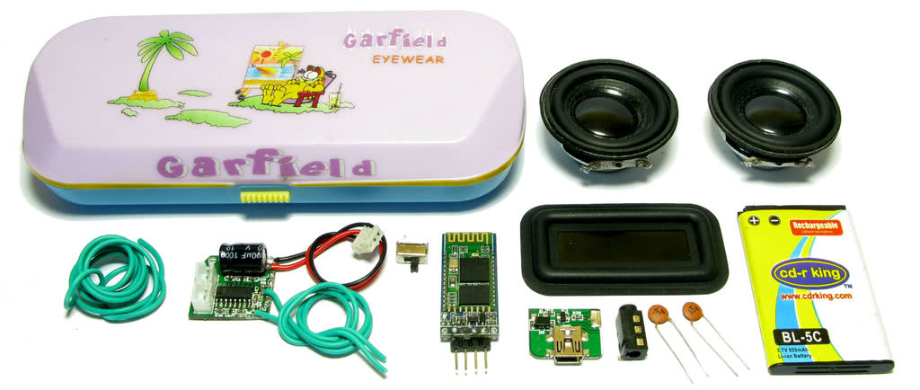 Электронная составляющая – модуль Bluetooth, например, модель BLK-MD-SPK-B. Стоит она на Aliexpress примерно $ 10. Нужны разъём и штекер в стандарте 3,5 мм, разноцветные провода, выключатель. Плату для усилителя под выбранный динамик собирают самостоятельно – на базе любой из микросхем с выходной мощностью от 1 до 10 Вт. На рынке электронных запчастей представлены сотни моделей готовых усилителей мощности звука.