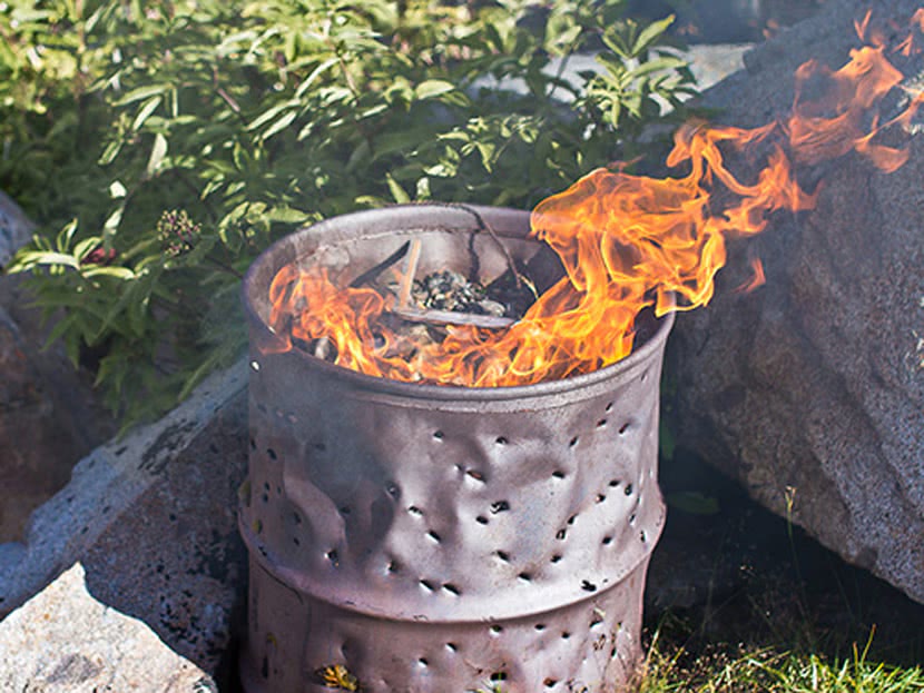 Шаг третий. Устанавливаем дырявую бочку на подготовленное основание, закладываем в нее мусор и разжигаем огонь.