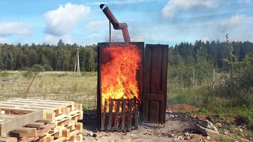 Готовые топки в основном достаточно компактные, но существуют и большие варианты, куда единовременно помещается много мусора. Если печь нужна для утилизации крупногабаритных предметов: досок, длинных веток и сучьев, бревен, то внутренний объем должен быть большим. Иначе придется несколько раз загружать отходы маленькими порциями и ждать, пока каждая партия прогорит, что будет неудобно и займет много времени.