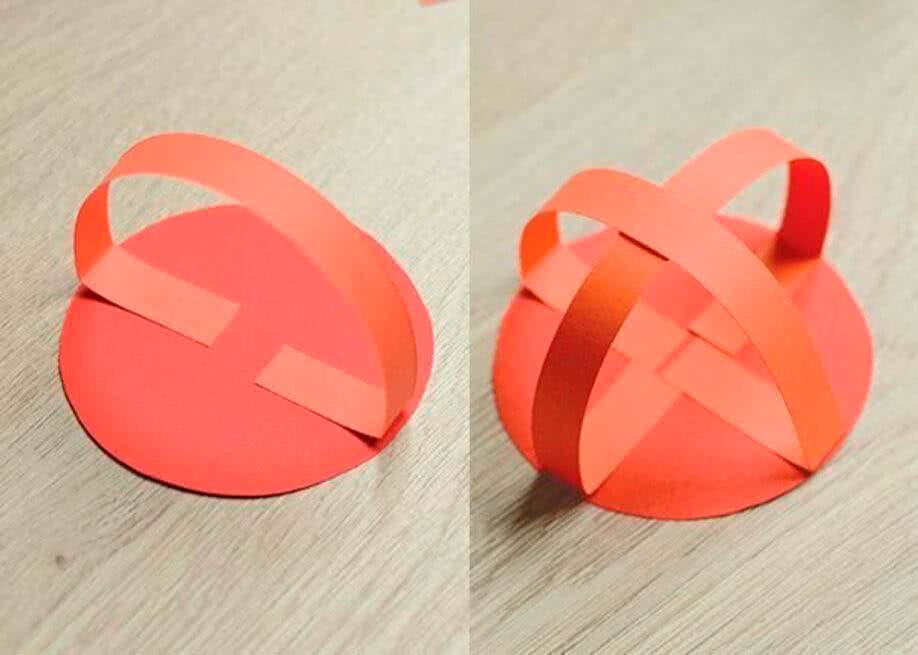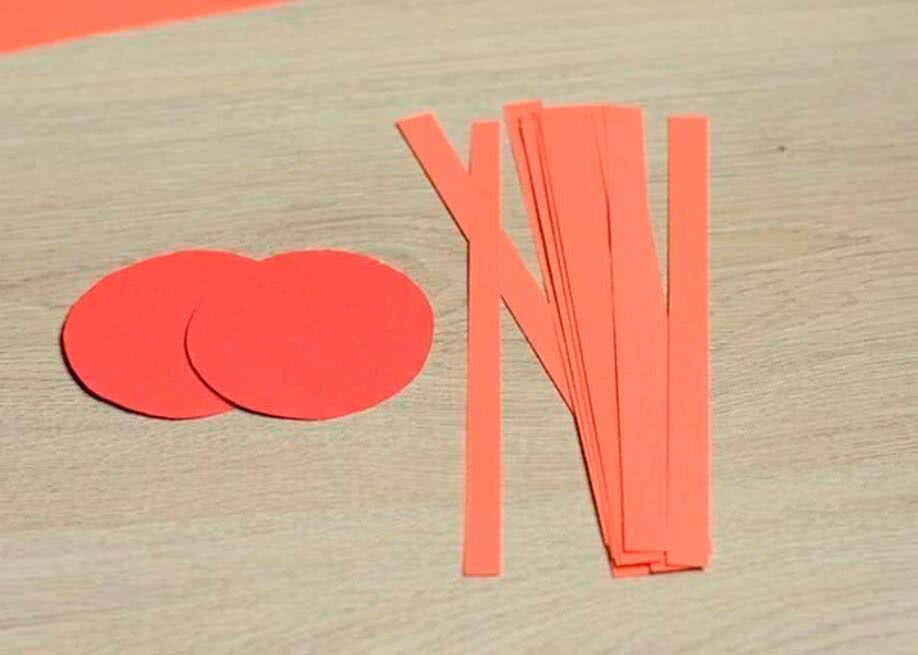 - Из листа красного цвета вырезаем круг. Затем нарезаем полоски из этой же бумаги шириной примерно 1 см.