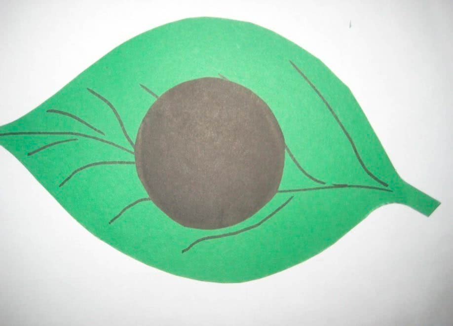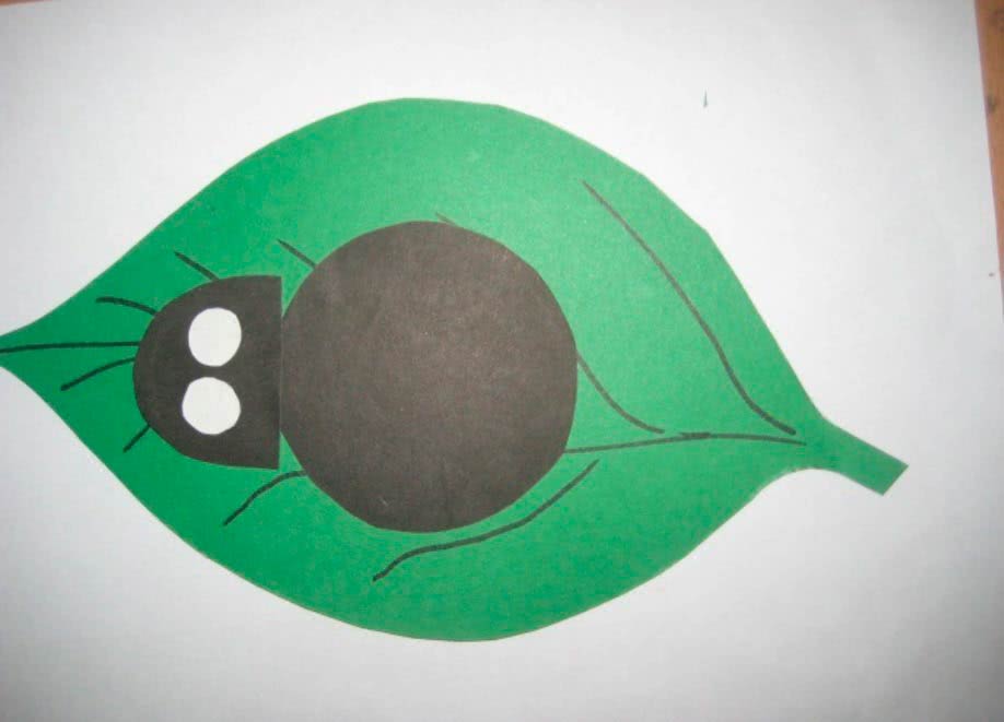 Приклеиваем на зеленый листик большой черный кружок, а на него – заготовку головы. Последняя деталь должна немного заходить на туловище.