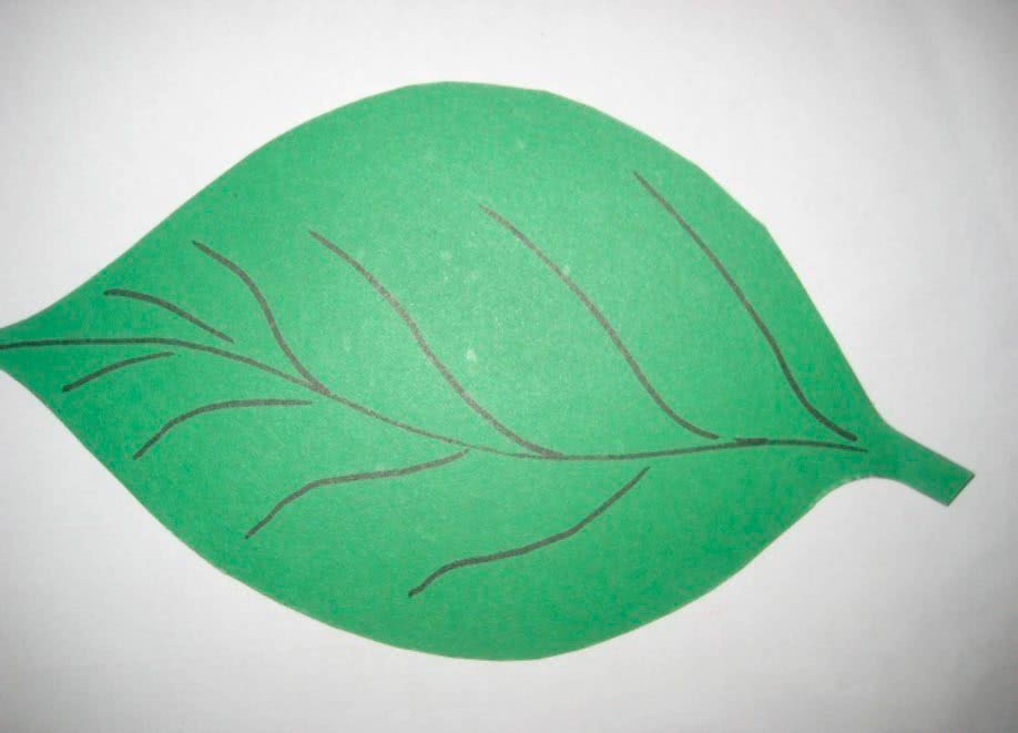 - Зеленую бумагу складываем пополам и рисуем на нем край листочка. Вырезаем по контуру и разворачиваем деталь – получается красивый готовый листочек, на котором будет сидеть будущая божья коровка.