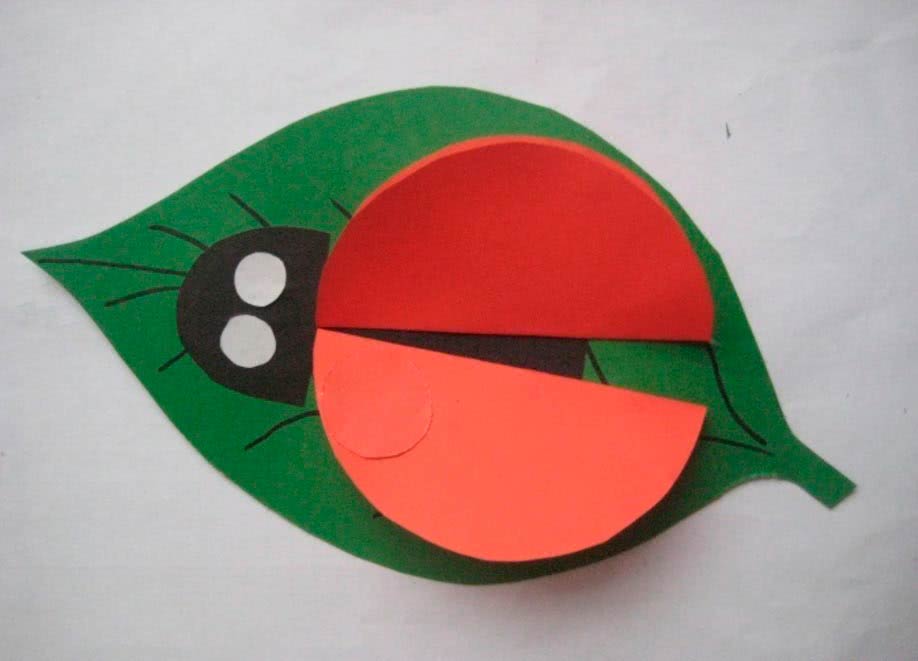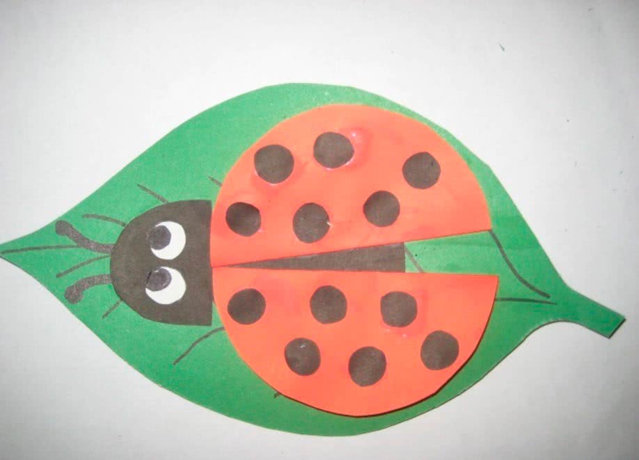 Еще одно объемное насекомое можно сделать из пластилина. Основа аппликации — плоский зеленый лист. Зубочисткой прорисовывают тонкие жилки на листочке, а из куска красного пластилина формируют круглое брюшко с плоским низом и рисуют на нем продольную полоску, разделяющую крылышки.