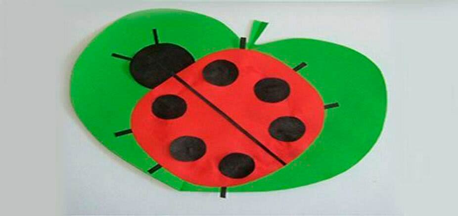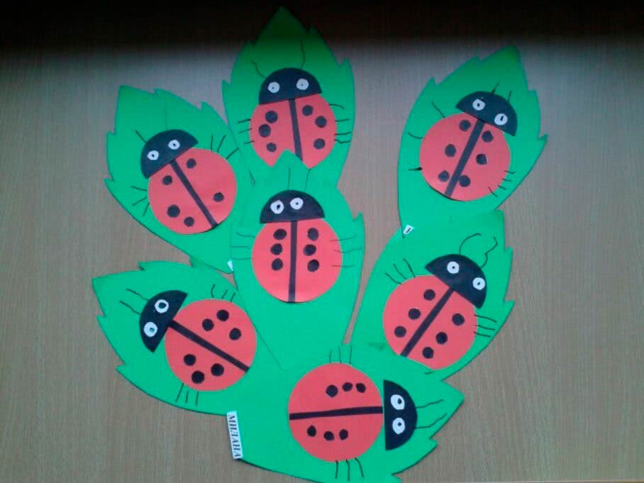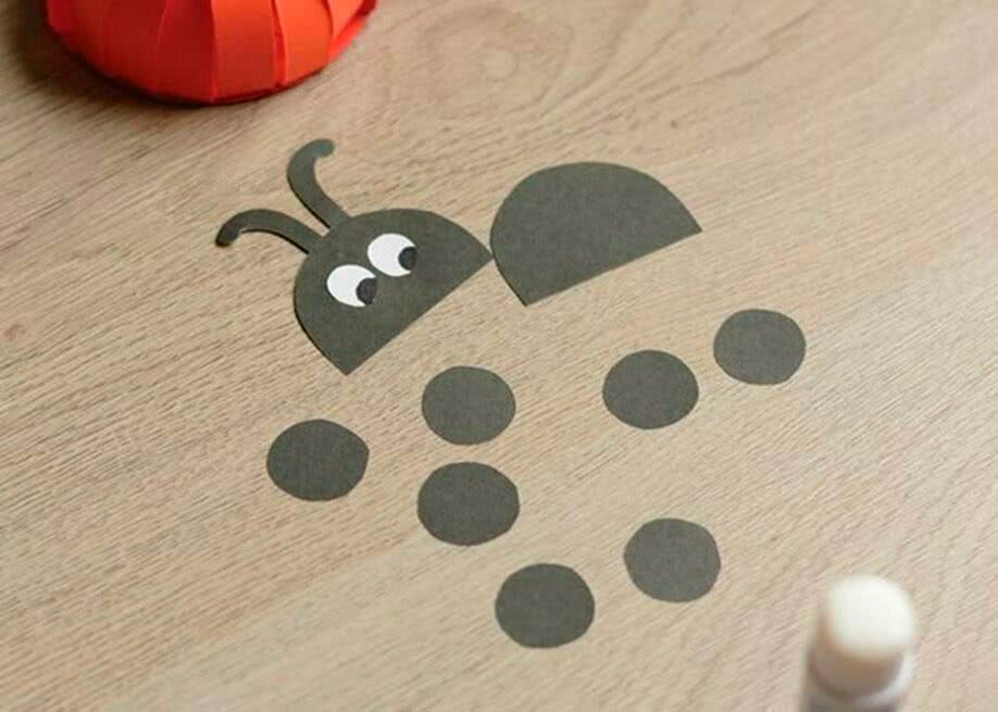 — так, чтобы между ними не оставалось пустого места. К полукругу головы приделывают глаза и усики, затем голову крепят к красному туловищу. Одно круглое пятно нужно приклеить посредине туловища, а остальные расположить хаотично по спинке.