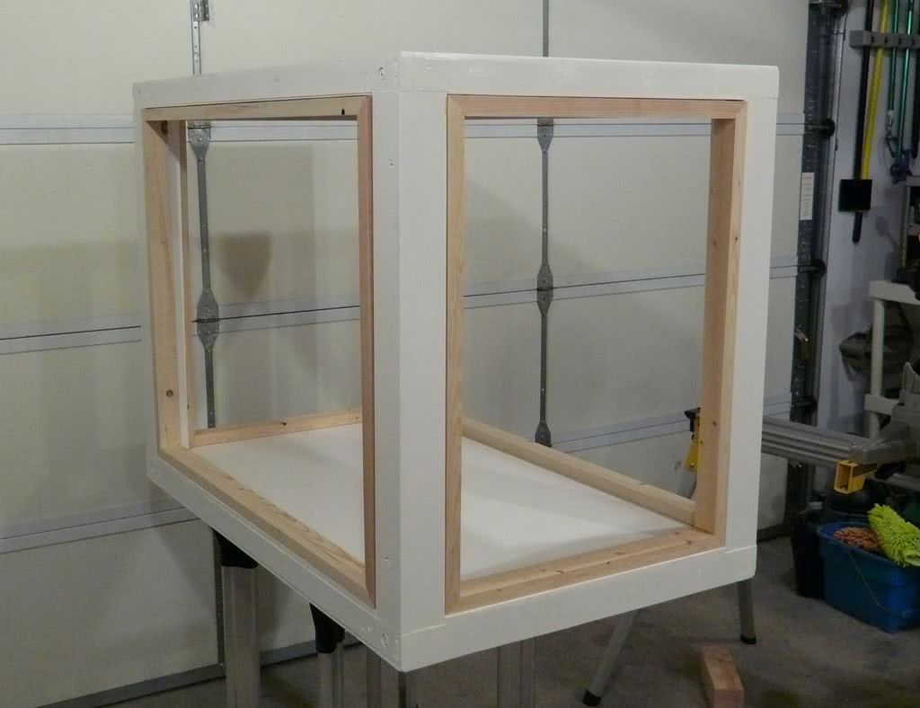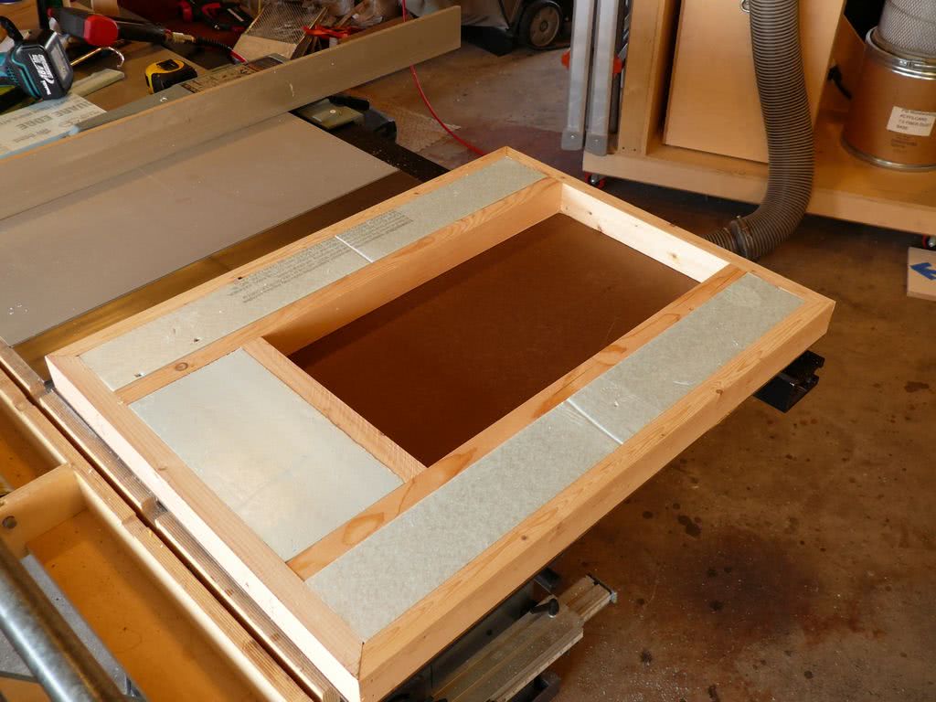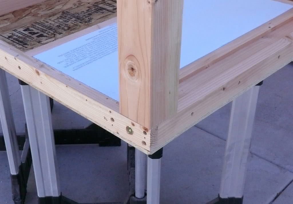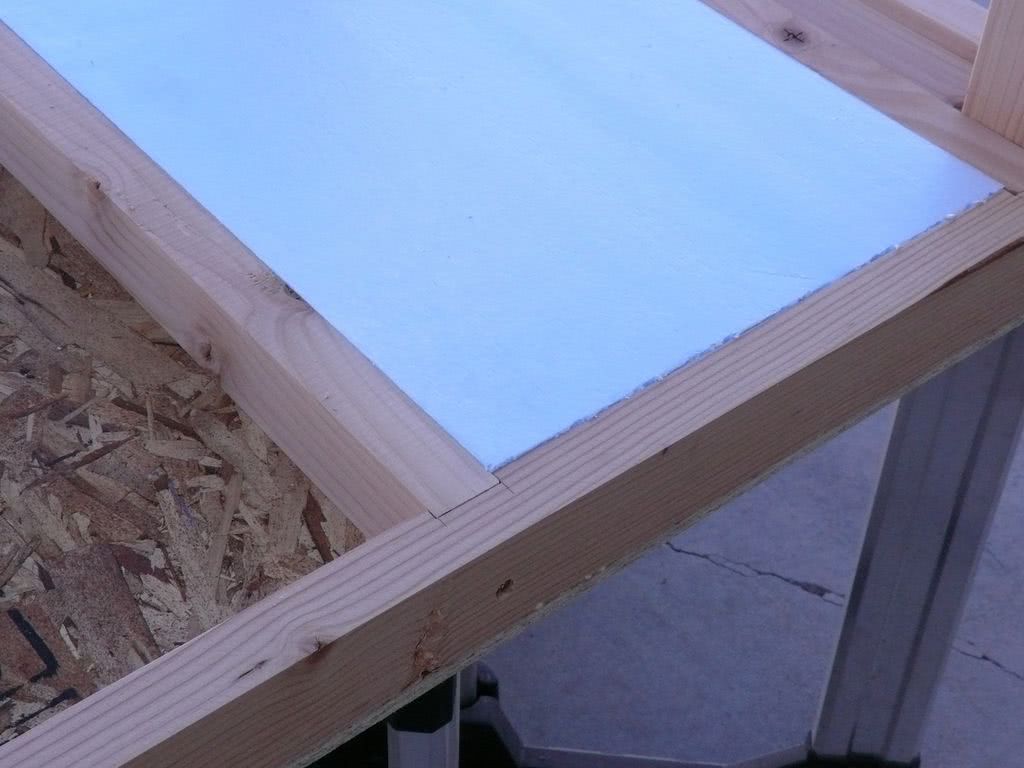 - Отрежьте 4 деревянных бруска сечением 40—50 мм по расчетным размерам и сделайте раму, скрепив их между собой на саморезах или стальных уголках.