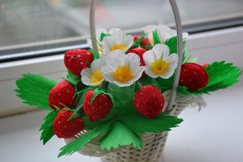 - Вырезаем зеленый черешок для каждой ягодки и приклеиваем его к основанию, зеленые листочки клеим к стеблю. Клубнику на зубочистке укрепляем в корзине вперемежку с цветками. Корзина готова.