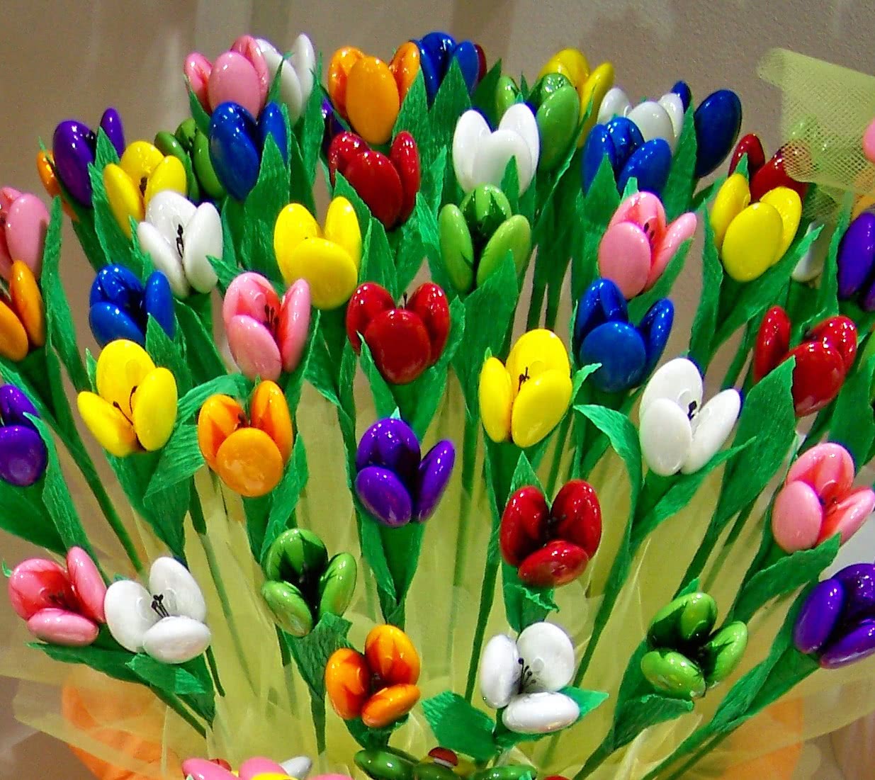 Серединками таких цветков послужат сладости. Если нужно, чтобы конфета вынималась без ущерба для цветка, то такой фокус отлично проделывается с тюльпаном. Это растение имеет 6 лепестков. Три из них, наружные, следует прикрепить к проволоке. Три внутренних – просто связать между собой и закрепить на них конфету. Сладость вынимается вместе с внутренними лепестками, которые можно водворить на место после того, как конфету получится отклеить. После изъятия съедобных частей такой букет из конфет превращается в изделие из искусственных цветов, которое способно простоять в вазе несколько месяцев.