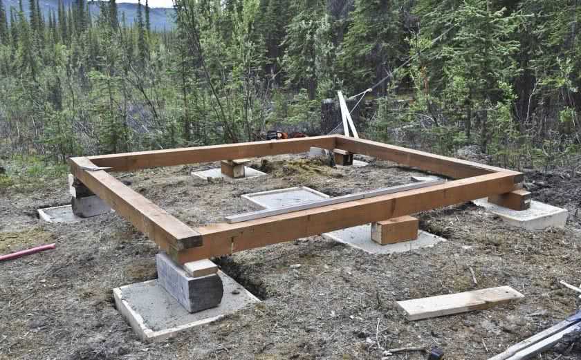 Приступаем к строительству каркаса нашей бытовки. Сначала укладываем деревянный брус по периметру будущего строения, а также по его центру для дополнительного упрочнения конструкции.