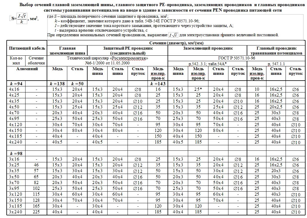 - Кроме того, в комплект устройства входит подводящая медная шина (её ещё называют электротехнической) с сечением, определяемым типом защищаемого оборудования и величиной токов стекания (смотрите таблицу на рисунке ниже).