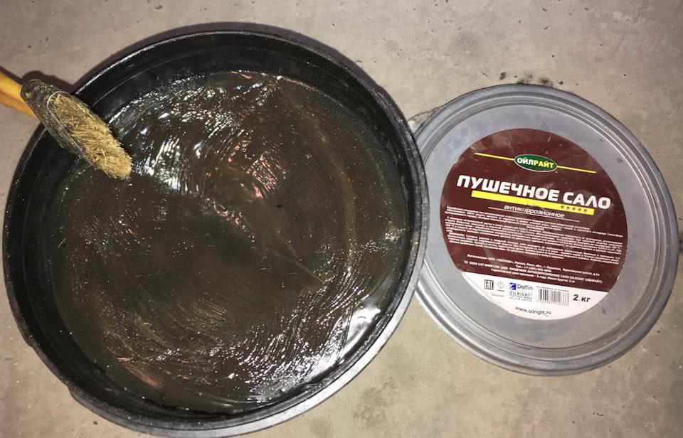 Применение пушечного сала удовлетворяет этим требованиям и создает надежную изоляцию от окружающей среды. Состав пушечного сала – нефтяное масло, которое загустили петролатумом и церезином. Для обеспечения эксплуатационных свойств добавляется антикоррозионная присадка.