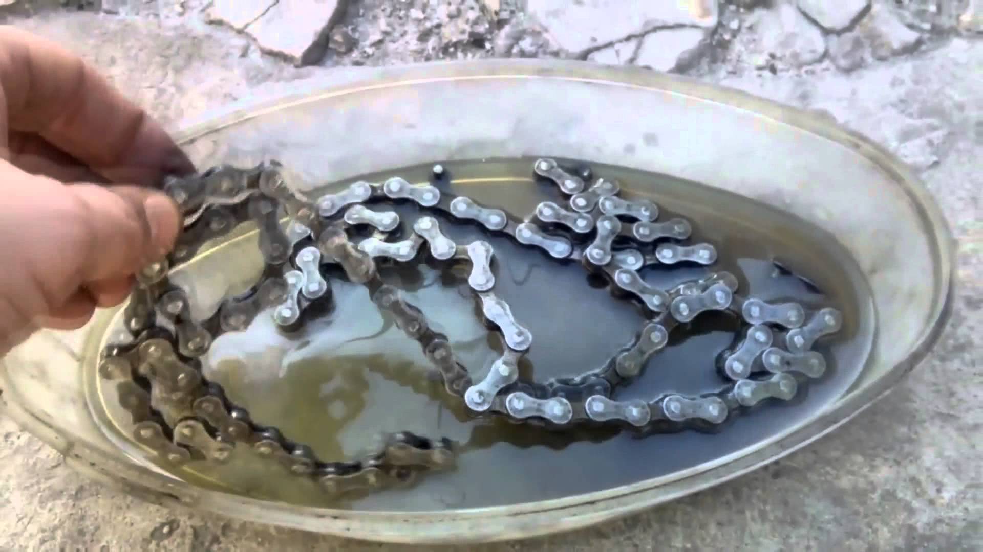 В металлической емкости разогревалось густое масло (лучше всего на водяной бане). Цепь погружалась в «кипяток», и варилась там до получаса. За это время жижа проникала в самые тонкие щели между пластинами звеньев.