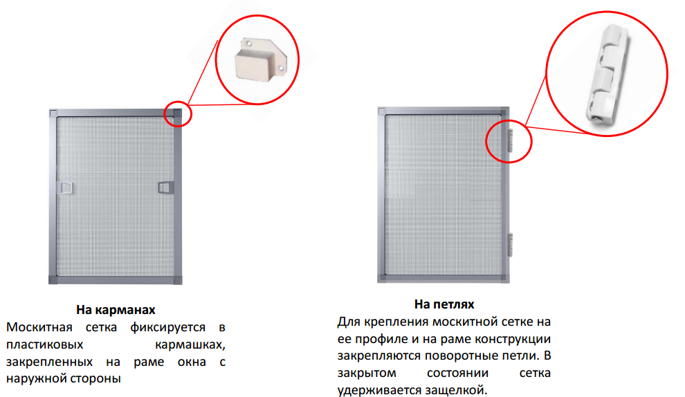 - Москитная сетка – сетка на алюминиевом или пластиковом профиле, которая фиксируется снаружи окна. Для крепления сетки используются петли, пластиковые карманы, крючки, плунжеры и другие приспособления разной степени надежности и удобства.