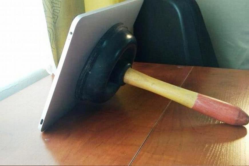 Еще один достаточно экстравагантный элемент поддержки планшета в вертикальном положение – это вантуз, смотрите на изображение и удивляйтесь увиденному.