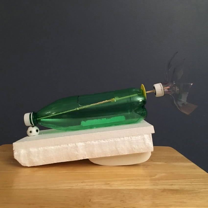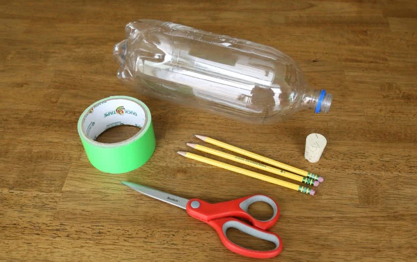 На дне бутылки необходимо пробить два отверстия и вставить туда гвоздики