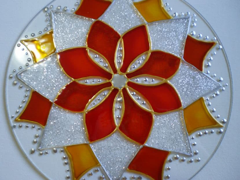 Для начала обезжириваем поверхность CD-диска спиртом либо одеколоном. После высыхания наносим несколько слоев гуаши, пока он не перестанет просвечиваться. В центральную часть вклеиваем картонный кружок, который должен быть немного больше чем отверстие в диске.
