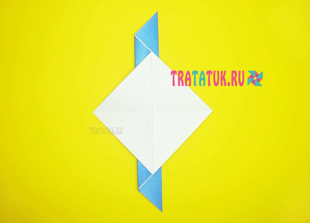 - Сгибаем листок по диагонали. Проводим черту ручкой по линии сгиба и ставим отметку на центре. Теперь к этой отметке подгибаем два боковых угла.