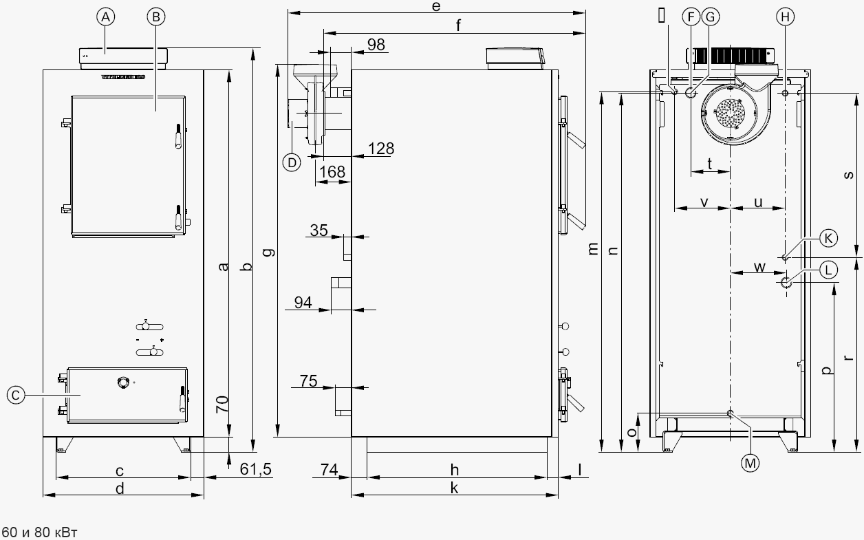 A — контроллер контура котла; B — дверца загрузки; C — крышка зольника; D — дымоотвод; E — муфта для датчика температурного предохранителя; F — патрубок предохранительного клапана; G — подающая магистраль контура; H — подвод холодной воды в теплообменник; L — обратная магистраль контура котла; M — расширительный бак